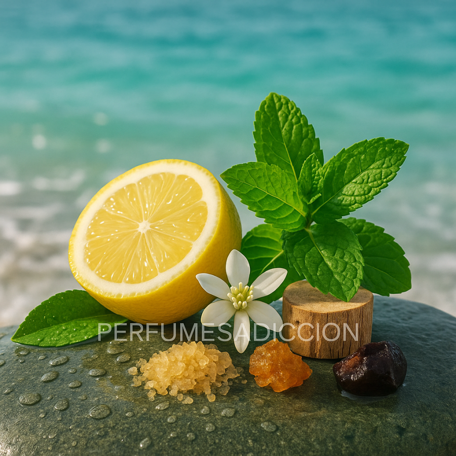 Frescura en estado puro: un estallido de menta y limón que se funde con un corazón floral acuático, limpio, luminoso y sereno. Aire, agua y calma sobre la piel.