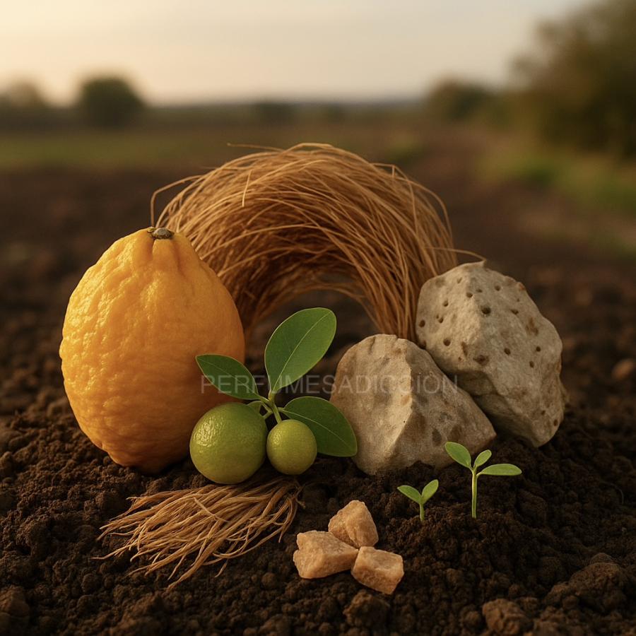 Un aroma terroso, cálido y profundamente masculino que huele a tierra fértil bajo el sol. Natural, elegante y auténticamente elemental.